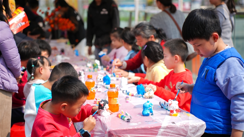 在創(chuàng)意手作區(qū),也吸引了眾多小朋友的目光。在這里大家可以用黏土塑造哪吒,用彩筆描繪敖丙,用糖畫(huà)勾勒太乙真人。還可以體驗(yàn)漆扇、香囊等非遺手作。各種創(chuàng)意手作活動(dòng)讓大小朋友們感受到了民俗文化與哪吒元素的奇妙融合,玩得不亦樂(lè)乎!