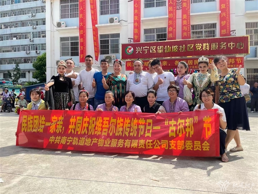為弘揚(yáng)民族文化,促進(jìn)民族團(tuán)結(jié),鑄牢中華民族共同體意識(shí),結(jié)合中國(guó)共產(chǎn)黨成立一百周年的契機(jī),望仙坡社區(qū)、新疆駐桂工作組、興寧區(qū)民宗局于2021年7月15日上午在望仙坡社區(qū)廣場(chǎng)開展古爾邦節(jié)民族文化宣傳活動(dòng),軌道地產(chǎn)物業(yè)公司黨支部作為黨建聯(lián)盟單位,受邀參加此次活動(dòng),與各族群眾一起共同慶祝維吾爾族傳統(tǒng)節(jié)日--“古爾邦”節(jié)。